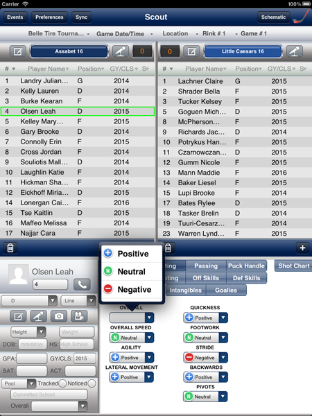 - Rate players using pre-defined hockey-specific metrics using a 1-5 or +/neutral/- rating system